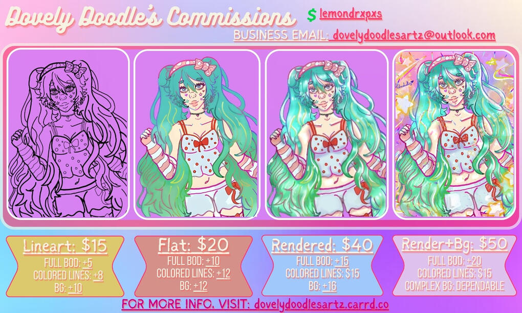 (Email, Twitter, Insta)♡ Title Commission emails as "Commission_YourName".♡ Progress shots are available upon Request. A progress sketch is default, but I will send further progress shots as well.♡ If you have any specific social media that you follow me on, feel free to tell me your username so I can @ you with the finished product!
